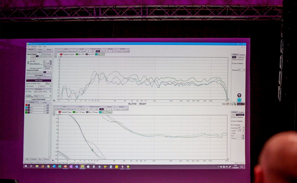Sämtliche Aufbauten wurden mit der Audio-Meßsoftware SysTune sowie gelegentlich Smaart 8 und bis zu 4 Mess-Mikrofonen erfasst. Zur Signalverteilung diente eine EV-Matrix, die auch die Filterung und das übrige Alignment der Systeme übernahm. Damit Teilnehmer mit ihren eigenen Smaart– oder SysTune Systemen mitmessen konnten, stellte Matze die einzelnen Meßsignale über ein Dante Netzwerk zur Verfügung.