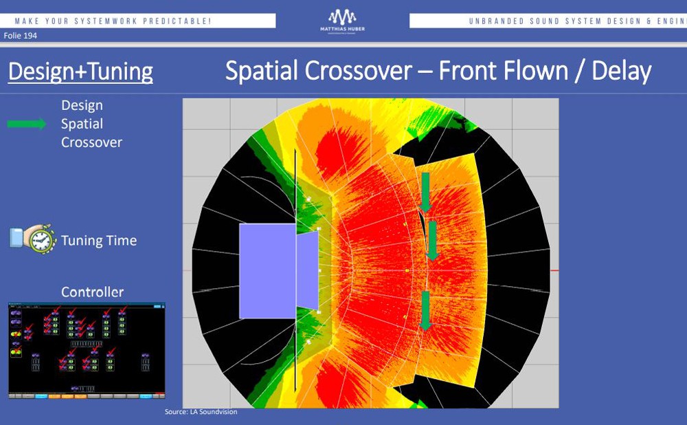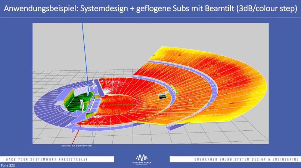 Als Endergebnis zeigte uns Matze, wie man für große Arenen systematisch ein Beschallungskonzept konfiguriert und umsetzt, das mit Line-Arrays, Bassclustern, Near- und Sidefills sowie Delays das gesamte Auditorium mit gleichmäßiger Tonalität und einem Pegel Unterschied von maximal 6 dB beschallt.