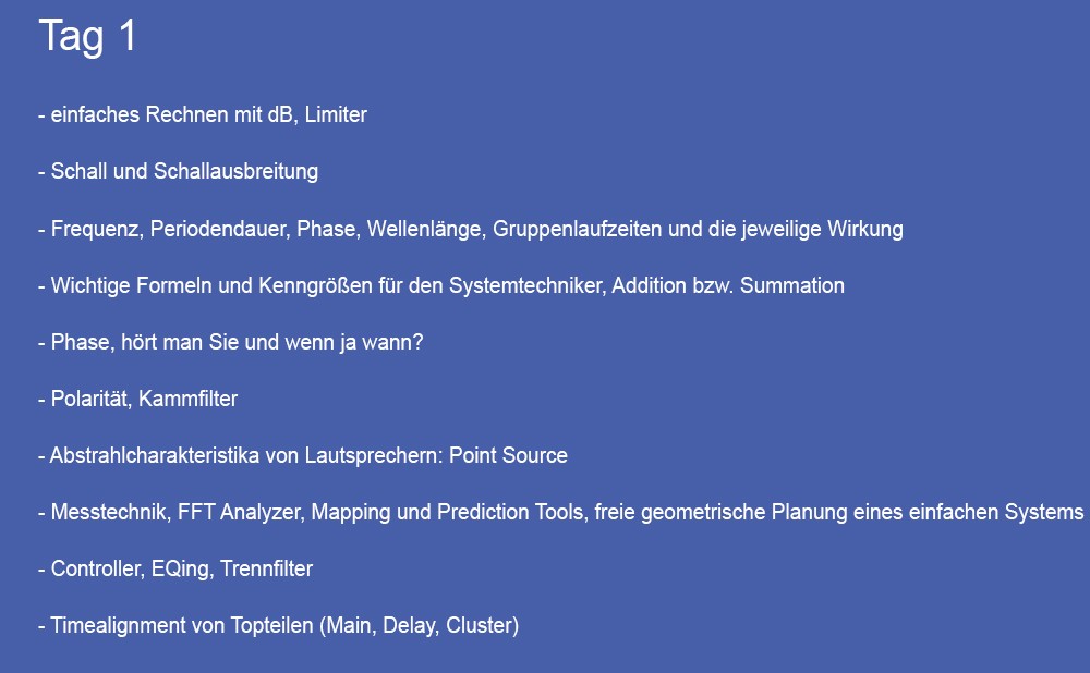 Etwas weiter oben sind nochmal die Hauptthemen unseres Seminars in der großzügigen RCF Academy Halle aufgeführt. Neben einem gründlichen Blick in die Funktionsweise und die richtige Anwendung aktueller Messsysteme (hier vor allem Smaart und Systune) wurden alle Aufbauten erklärt und die entsprechenden Messungen analysiert.