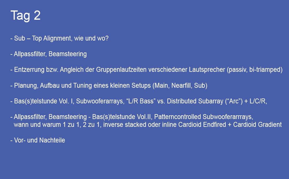 Um den Schluss vorwegzunehmen: Zum Ende des Seminars waren die Einstell- und Kombinationsmöglichkeiten fast beliebiger Lautsprecher-Kombinationen durchgesprochen bis hin zum Beamsteering in Line-Arrays. (Beam Steering, zu deutsch: Strahllenkung – beschreibt die erzwungene Steuerung eines Hauptstrahls durch Ändern der Phasen der beteiligten Einzelelemente)