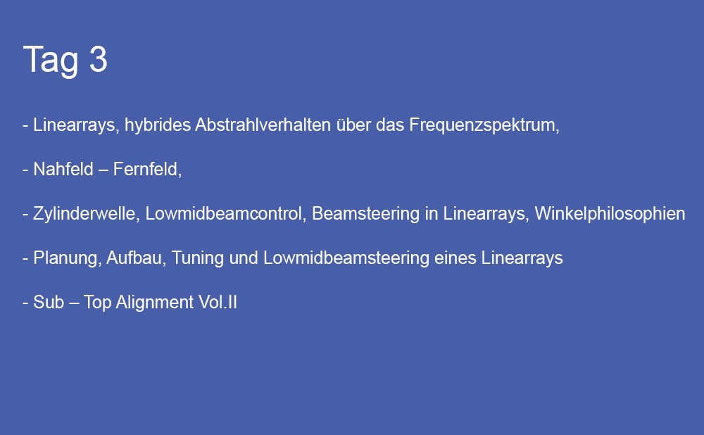 Das letzte Thema des Seminars war die gründliche Einführung in die Theorie und Praxis der Line-Array Systeme. Auch dabei wurden alle Einstellmöglichkeiten ausführlich erläutert, darunter (fast) alle Strategien, wie man Beamforming und Pegelgleichheit auf große Distanzen erreicht.