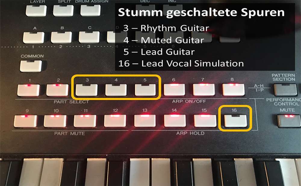 Wenn wir im kleinen Setup (wie zuletzt mit Sänger, Gitarre und Keyboard) auftreten, verwenden wir Backing-Tracks , um die fehlenden Instrumente (hier: Bass und Schlagzeug) hinzuzufügen. Natürlich kann man solche Aufnahmen auch fertig kaufen. Aber ich erstelle ausnahmslos alle Tracks mit dem integrierten MIDI-Sequenzer meines Keyboards. Außerdem nutze ich die Gelegenheit, unsere Live- Versionen einzuspielen (hier ein bisschen länger, dort ein anderer Akkord oder ein ungewöhnlicher Schluss) und die eine oder andere Spur hinzuzufügen (wie z. B. Chor, Streicher, Bläser).
