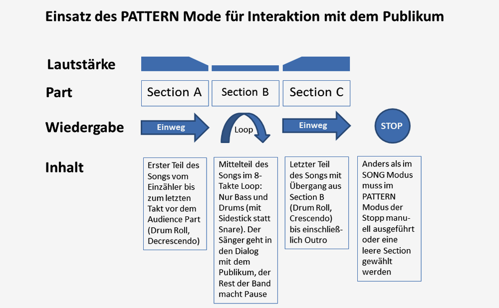 Für Songs, bei denen wir das Publikum zum Mitsingen einladen, setzen wir den sogenannten Pattern-Mode ein. Diese Pattern (Muster) bestehen aus einzelnen Segmenten (wie Intro, Vers, Chorus, Solo, Bridge oder Outro), aus denen wir einen Song zusammen bauen – ähnlich wie mit einem Lego-Baukasten.