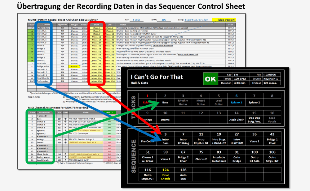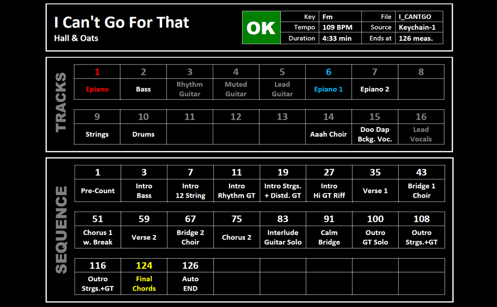 Um den Überblick zu behalten, habe ich mein eigenes Sequenzer Control Sheet entworfen. Der obere Teil (OK) enthält Titel, Interpret und einige andere grundlegende Informationen wie Tonhöhe, Tempo und Dauer. Der zweite Teil (TRACKS) bietet einen Überblick über die 16 Spuren mit den bei diesem Song zum Einsatz kommenden Sounds. Die von mir stummgeschalteten Spuren – das sind die Musiker, die am Abend präsent sind und mitspielen – sind ausgeblendet, während die Sounds, die ich dann auf der Bühne verwende, hervorgehoben werden.