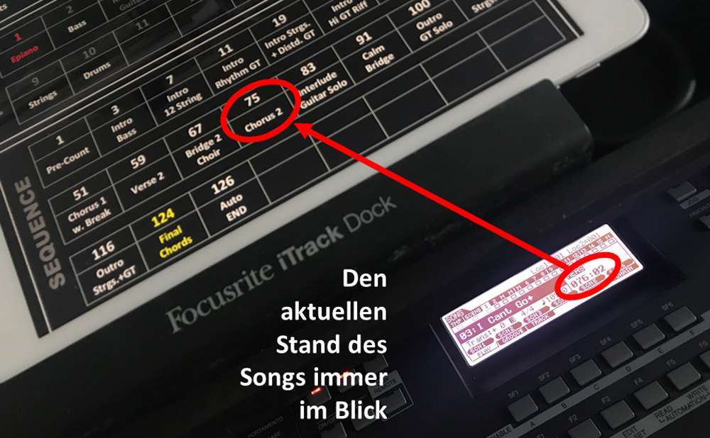 Der Sequenzer zeigt mir den jeweils aktuellen Takt an. So kann ich sofort feststellen, an welcher Stelle des betreffenden Songs wir uns gerade befinden. Das gibt mir ein wesentlich sicheres Gefühl als der übliche Blindflug mit einem Backing Track Tape .
