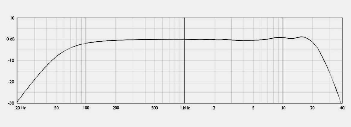 Das Mikrofon hat einen weitgehend linearen Frequenzgang im für Gesang relevanten Bereich. Ab ca 100 Hz geht es bis an die Grenzen des Hörbereiches, also 20 kHz. Unnötige Störgeräusche im Bassbereich werden durch einen steilflankigen Filter unterdrückt.