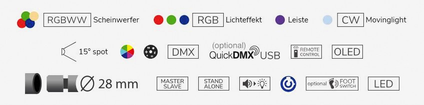 Die PAR Spots mit der 4-farbigen RGBW Bestückung liefern je 21 W und ermöglichen damit eine komfortable Farbmischung. Mit 15° Abstrahlwinkel sind sie gut für eine Leuchtdistanz bis ca. 8m einsetzbar.