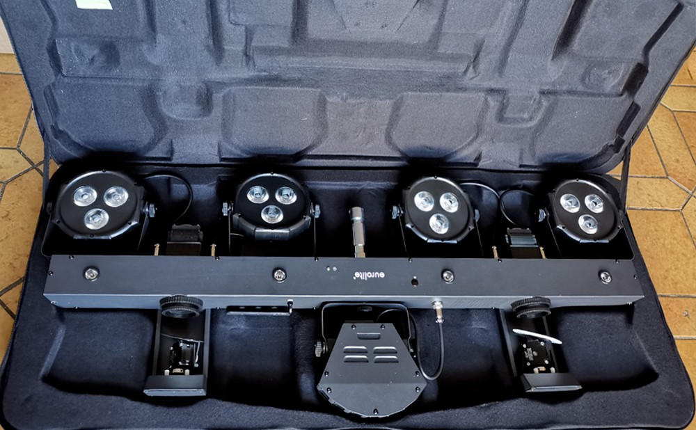 Hier handelt es sich um eine moderne „All in One“ Lösung, nämlich eine Quertraverse (Bar), auf der 4 LED PAR Scheinwerfer, ein Derby und 2 Scanner nebst 4 integrierten UV-Lampen als Partyeffekte montiert sind. Mit diesem Kompaktlichtset ist man bestens für viele Veranstaltungen ausgestattet:
