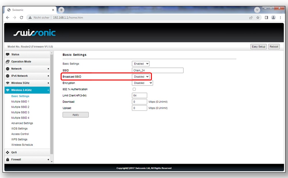 - Deaktiviert die Broadcast der SSIDs, sodass der Router nicht mehr in der Liste der zugänglichen WLAN-Systeme angezeigt wird. Dadurch wird verhindert, dass Euer Router von den Mobiltelefonen des Publikums gescannt wird. Der Datenverkehr, der den Prozessor Eures Routers unnötig belasten würde, geht deutlich zurück. Diese Einstellung muss sowohl im 2.4 GHz als auch 5 GHz vorgenommen werden.