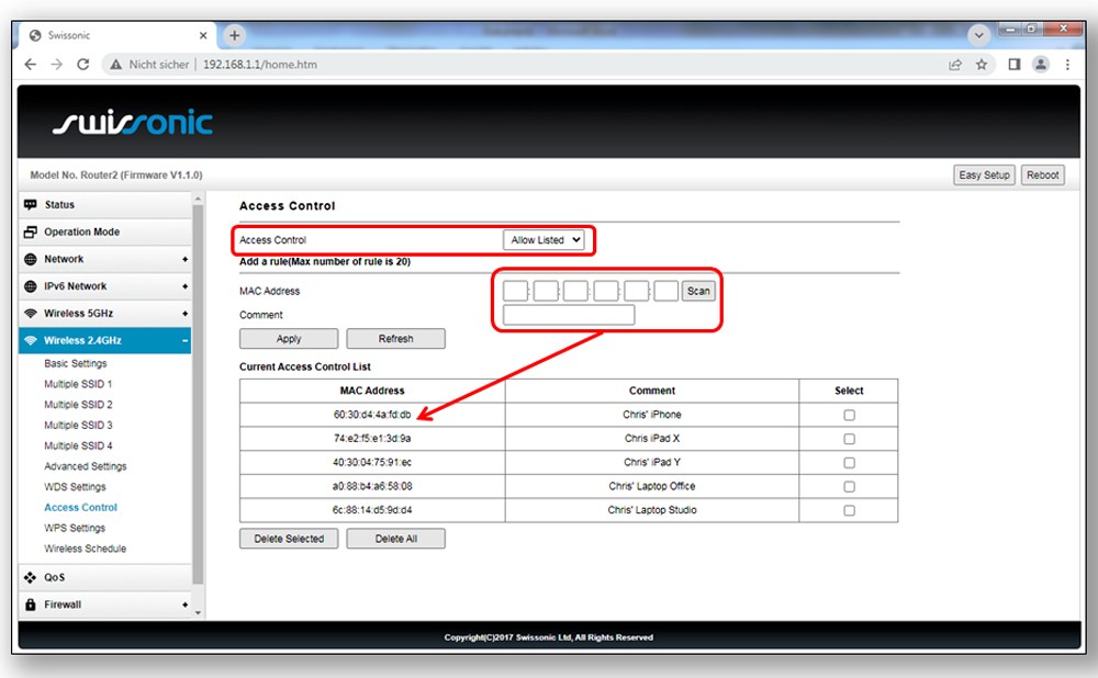- Gebt die MAC-IDs Eurer Endbenutzergeräte (Smartphones, Tablets, Laptops) und der Eurer Bandkollegen in die internen MAC-Adresstabellen des Routers ein, wodurch alle anderen Geräte abgelehnt werden. Bei unserem Swissonic-Router haben wir diese „Allow Listed“-Tabellen unter > Advanced Setup > Wireless 2.4 GHz / 5 GHz > Access Control gefunden (andere Hersteller nennen es „MAC-Filter“). Es gibt eine Tabelle für das 2,4-GHz-Netzwerk und eine separate für 5 GHz, die man synchron halten sollte.