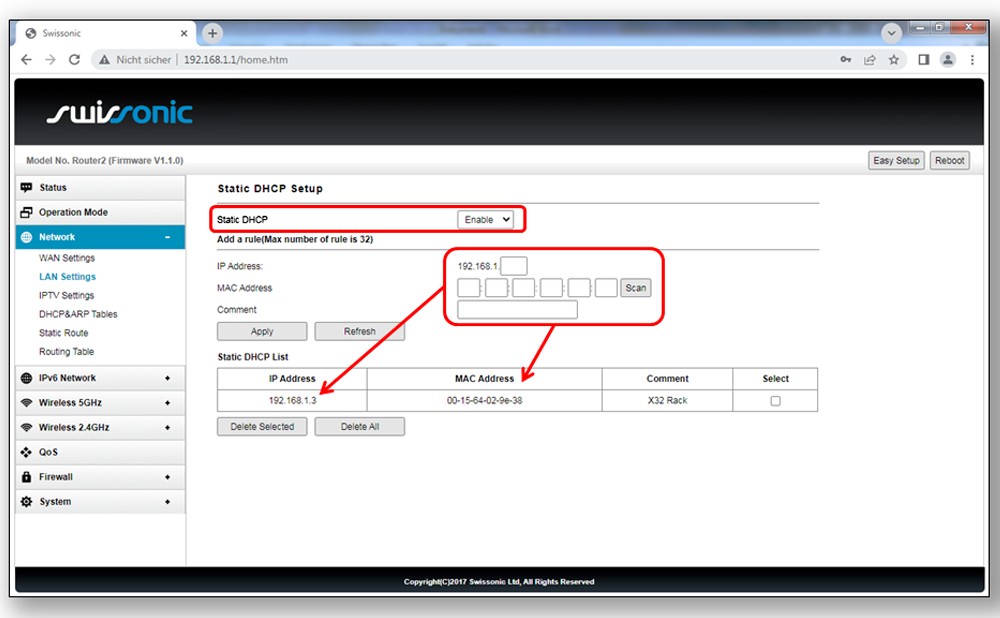 - Weist dem X32 Rack, das per Kabel mit dem Router verbunden ist, eine feste IP-Adresse zu. Die MAC ID des X32 findet man am unteren Ende des Displays im Menü SETUP > NETZWERK . Diese trägt man an entsprechender Stelle des Routers ein und legt die IP Adresse fest. Für die Endgeräte der Musiker ist diese Maßnahme nicht erforderlich. Da der X32 Router nur von wenigen Geräten gleichzeitig verwendet wird – unser Durchschnitt liegt unter 10 – würde dies die Anmeldezeit nicht wesentlich verkürzen.