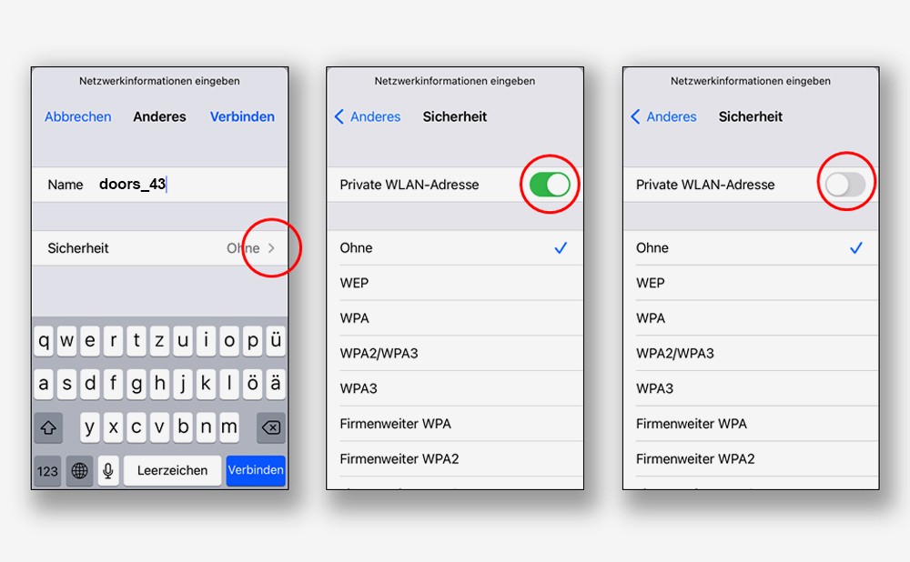 Aber, es gibt noch eine letzte Hürde. Denn die neueren IOS- und Android-Versionen ändern sporadisch die MAC-Adresse der damit betriebenen Smartphones und Tablets. Das Ganze nennt sich „Private Mode“ , den man aber per Schalter deaktivieren kann. Dabei handelt es sich jedoch nicht um eine globale Einstellung, sondern sie gilt nur für das jeweilige Netzwerk und wird zusammen mit dem Namen des Netzwerks auf dem Smartphone bzw. Tablet gespeichert.