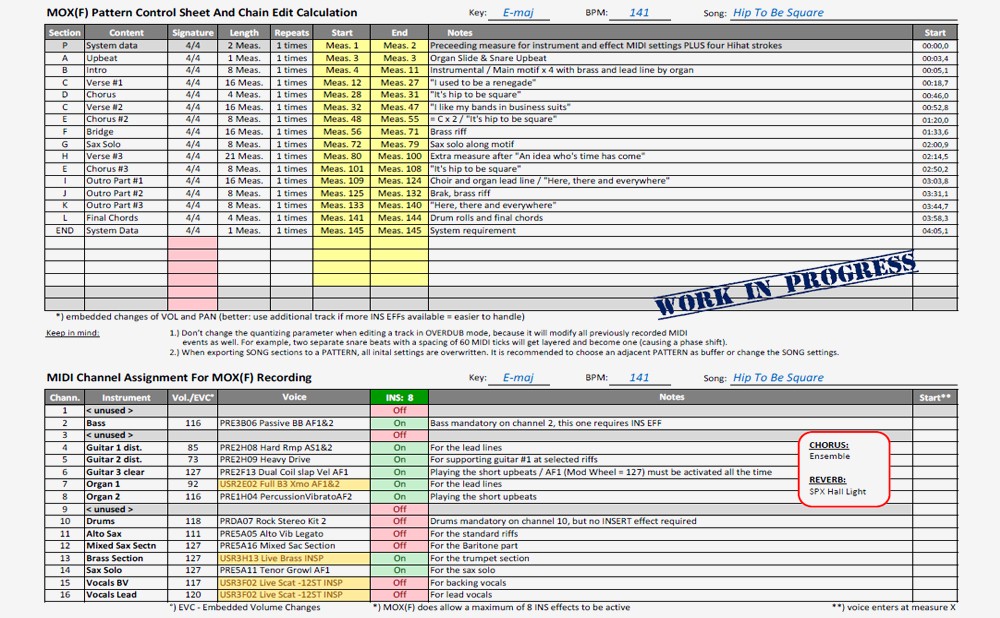 Vor Jahren noch undenkbar, aber heute Realität: Wir haben mit der von mir genutzten Workstation alle(!) Instrumentalspuren einer kompletten CD aufgenommen und lediglich noch die Lead und Backing Vocals hinzugefügt. Um bei den z.T. recht umfangreichen Einspielungen den Überblick zu behalten, habe ich mir ein EXCEL Sheet angelegt: Ich notiere mir darauf, welche Instrumente in Kombination mit welchen Effekten oder Zusatzfunktionen ich auf welcher Spur einsetze und wie die Abfolge der von mir eingespielten PATTERN aussieht, aus denen ich die SONGs zusammen gesetzt habe.