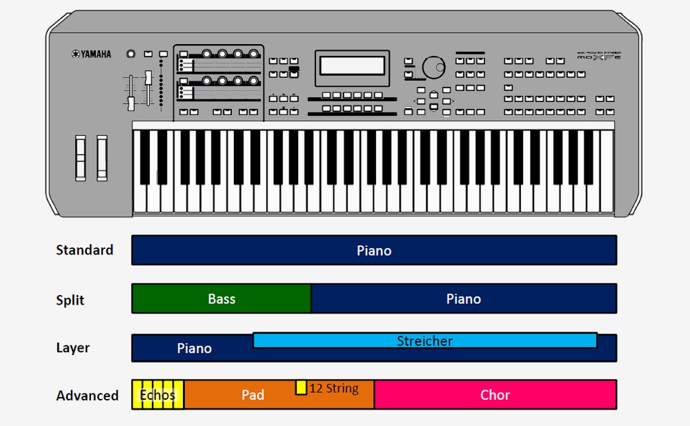 Wie eingangs erwähnt, gibt es bei Workstations die Möglichkeit, die Tastatur in verschiedene Bereiche zu unterteilen (SPLIT Modus). Eine einfache Variante wäre es z.B. dem linken Bereich die Stimme eines Fretless Bass zuzuordnen und dem rechten Bereich ein Grand Piano.