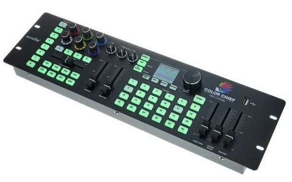 Mit seinen 3 Höheneinheiten und einer Breite von 48,3 cm = 19″ lässt sich der Eurolite Color Chief problemlos in ein Bühnenrack einbauen. Ausstanzungen zur Befestigung im Rack sind standardmäßig am Pult befestigt. Somit ist das Pult nicht nur für FOH-Menschen, sondern auch für Musiker interessant, die ihr Licht von der Bühne aus steuern wollen.
