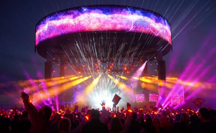 Links und rechts der Bühne gehen jeweils 30 Meter lange Flügel ab, ergänzt um zwei diagonale Catwalks im vorderen Bühnenbereich. Als absoluter Blickfang fungiert der „Halo“ – ein 52 Meter breiter und sechs Meter hoher LED-Screen mit 15 Millionen Pixeln.