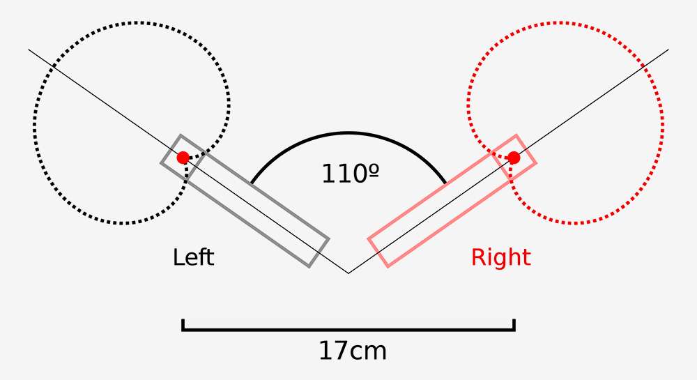 Mikrofone in ORTF-Anordnung (Office de Radiodiffusion Télévision Française – wurde 1964 vom französischen Runkfunk entwickelt): Äquivalenz-Stereofonie / © Iainf für Wikipedia