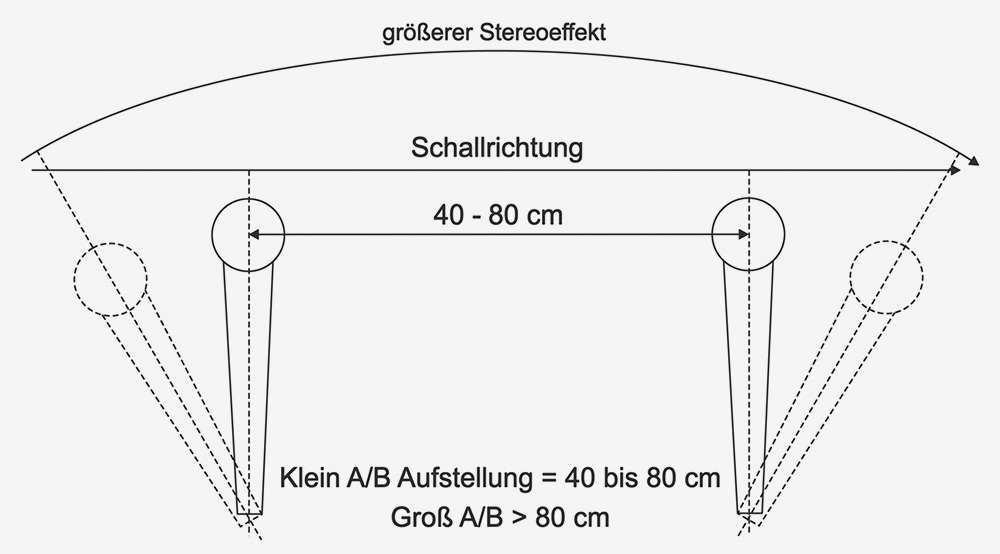 Klein A/B Aufstellung: Unter der Voraussetzung, dass die Mikrofone eine Richtwirkung axial nach vorne haben, können die Mikros für einen größeren Stereoeffekt auch schräg auseinander gestellt werden. / © Andy C.