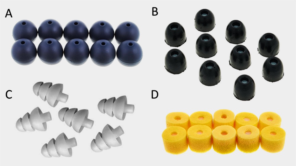 Bei diesen Earplugs (auf Deutsch: Ohrpassstücke) gibt es recht unterschiedliche Formen wie z.B. pilzförmige Silikonpolster mit großer Lippe (A), kegelförmige Silikon-Tannenbäume (C) und zylindrische Schaumstoff-Rollen (D). Andere Anwender schwören auf Memory Foam Plugs (B). Sie werden vor dem Einsetzen in’s Ohr zusammengedrückt, in diesem Zustand in’s Ohr eingeführt, dehnen sich dort wieder aus und sitzen dann ziemlich fest …