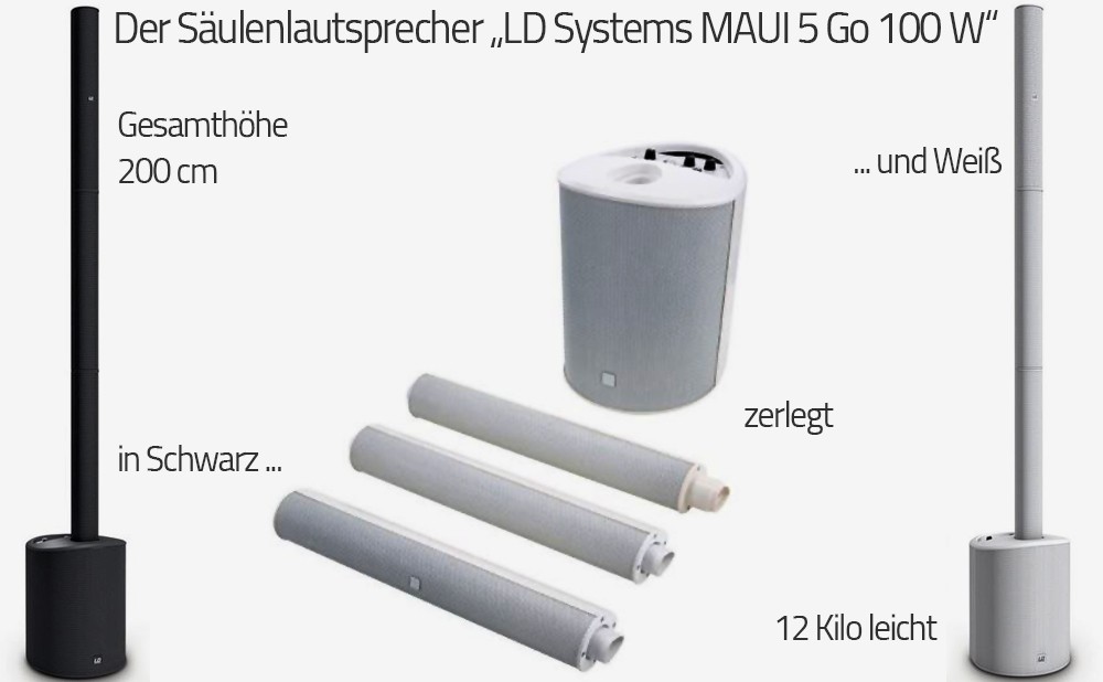 … Dann haben wir was für euch. Für das Partnerportal Amazona.de haben wir den LD Systems Maui 5 Go100 , einen akkubetriebener Säulenlautsprecher der Firma Adam Hall getestet.