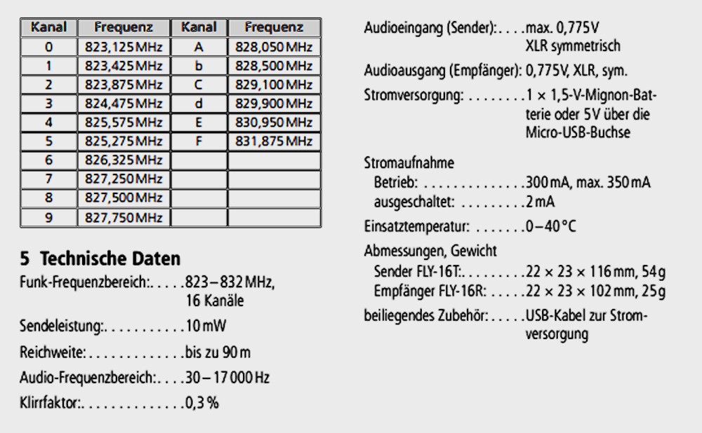 FLY-16 sendet im EU-weit anmelde- und gebührenfreien Bereich 823-832 MHz, einer so genannten Mittenlücke. Dabei stehen 16 Frequenzen zur Verfügung, von denen 8 störungsfrei gleichzeitig nebeneinander betrieben werden können. Die Geräte arbeiten analog, also verzögerungsfrei und verarbeiten Line Pegel bis zu 0,775 V.
