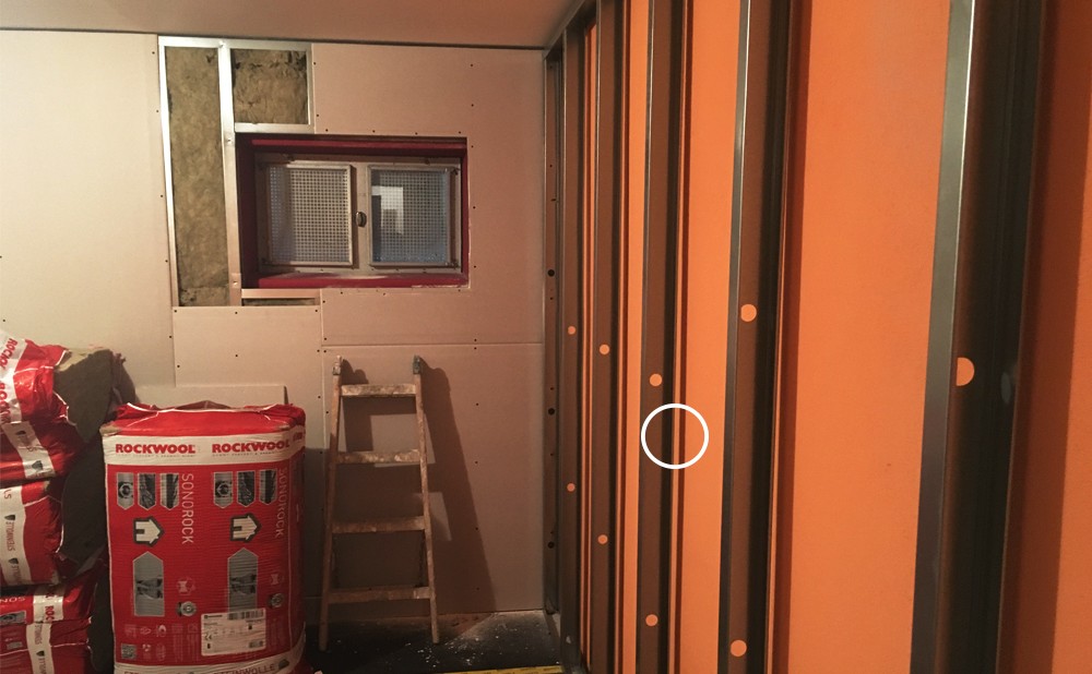 Nach der vollständigen Auskleidung wird das Ständerwerk mit Gipskarton-Platten beplankt. Es handelt sich ebenfalls um ein Material, welches den Schall gut absorbiert. Dabei werden Gipskarton-Platten auf die U-Profile geschraubt.
