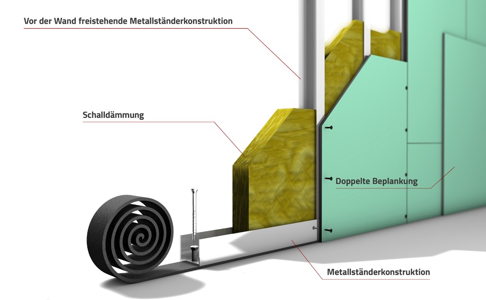 Dies wird zusätzlich durch die Breite des Spaltes beeinflusst, der zwischen der neu errichteten Wand und dem Mauerwerk ist – je breiter, desto stärker die Schallreduzierung. Wie manchem bekannt, ist Luft ebenfalls ein guter Isolator.