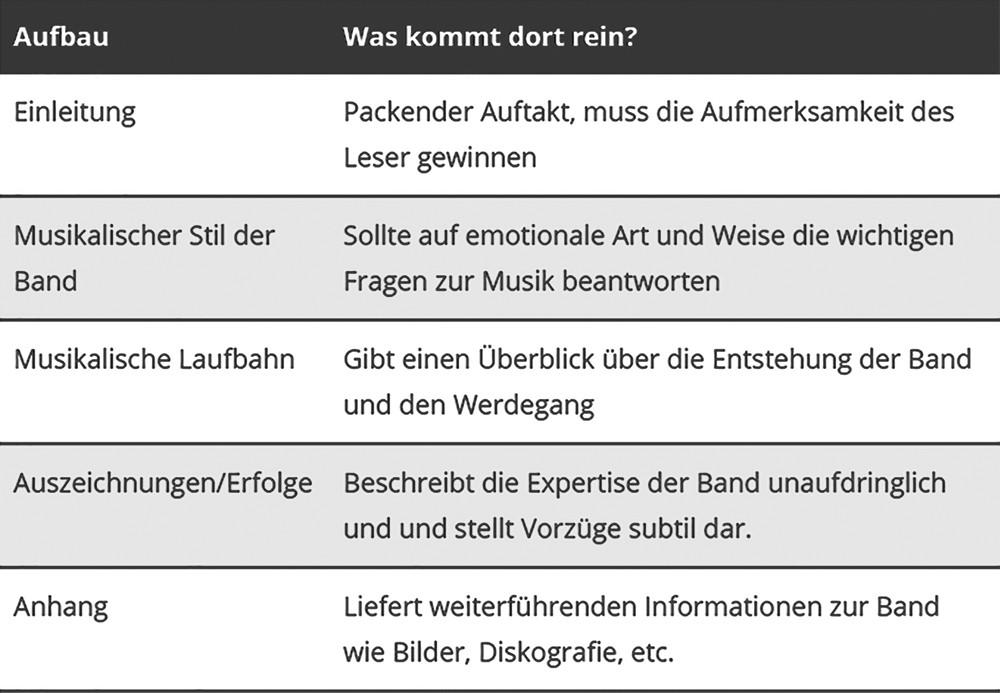 Die Bandinfo selbst sollte in mehrere mit Überschriften versehene Abschnitte gegliedert sein, welche mit positiven Pressezitaten oder interessanten Zeilen aus Songtexten aufgelockert werden. Das erleichtert Menschen mit wenig Zeit, schnell zu erfassen, ob eure Bandinfo lesenswert ist . Gleichzeitig erhält man einen ersten Überblick.