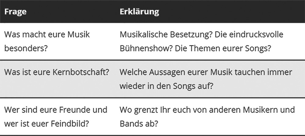 Damit der Redakteur oder Labelchef Eure Band einordnen kann, ist eine konkrete Beschreibung der Musik und deren Alleinstellungsmerkmal wichtig. Beantwortet die Frage nach den Inhalten, welche Ihr behandelt und die Hintergründe der Musik.