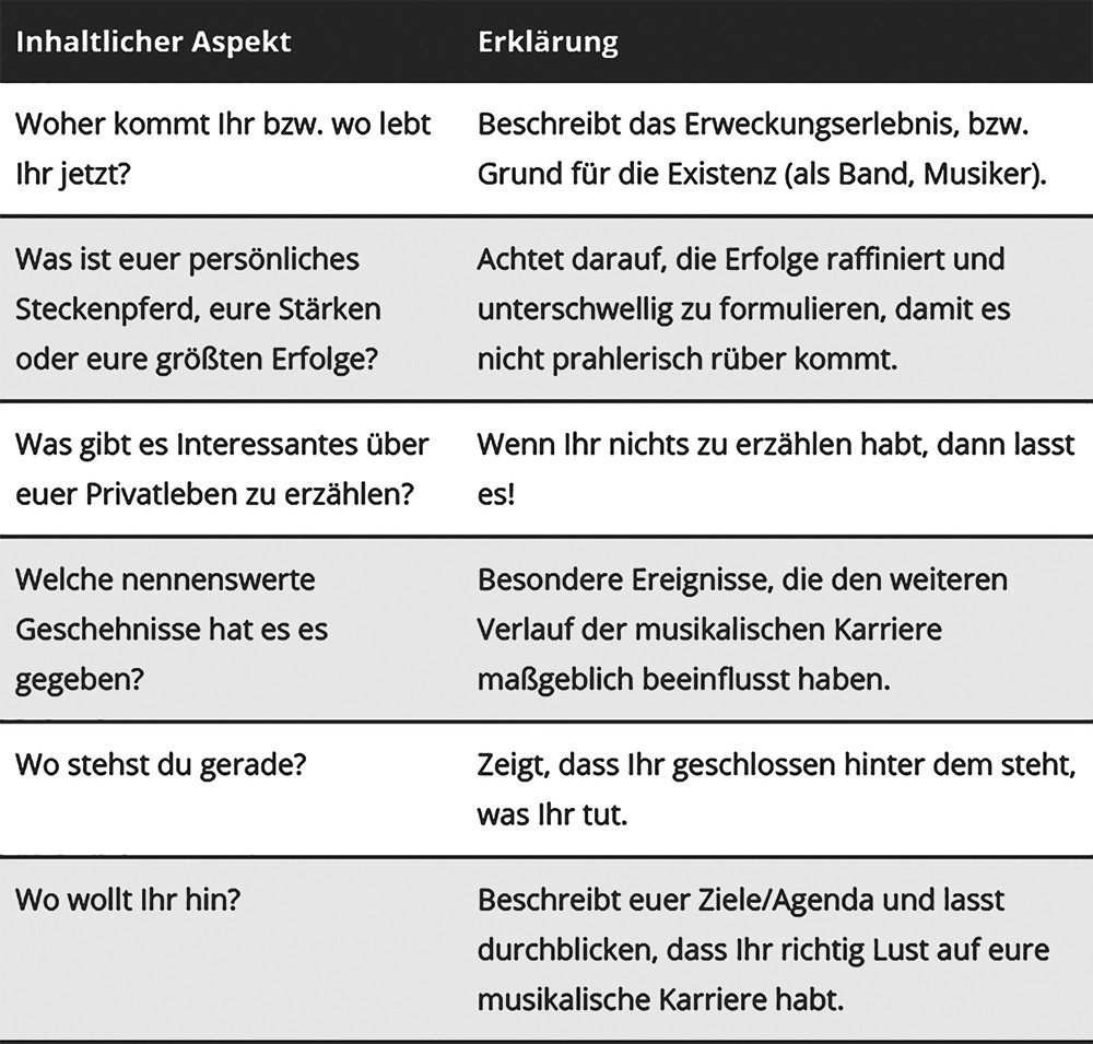 Gerne könnt Ihr Euch auch einfach ein interessantes Detail aus der Bandgeschichte herausgreifen. Hinter guten Songs stecken häufig gute Geschichten. Es gibt vielleicht zahlreiche Anekdoten, welche Ihr vor der Aufführung der Songs auf der Bühne erzählt. Macht euch Gedanken, welche Erlebnisse in engem Zusammenhang mit der Band stehen und was als Einstieg in die Bandbiografie funktionieren könnte.