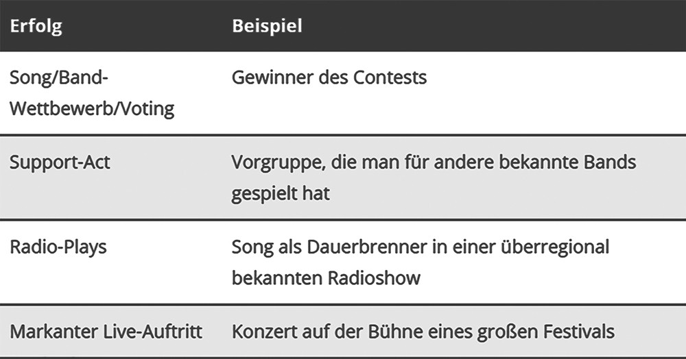 Solche Zahlen haben jedoch nichts in der Band-Info verloren, bis man eine besondere Marke an YouTube-Views oder Facebook-Fans im fünfstelligen Bereich geknackt hat. Als Newcomer kann man aber auch mit anderen Erfolgen punkten. Die wichtigsten möchte ich euch im Nachfolgenden aufführen.