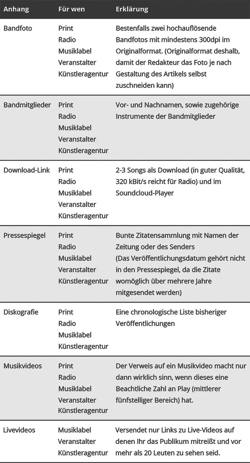 Ebenso wenig wird die Presse in einem großen Artikel über euch berichten, wenn Ihr kein hochauflösendes Bandfoto sowie die Vor- und Nachnamen der Bandmitglieder, und dem Instrument, das sie spielen, mitliefert.