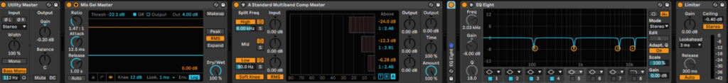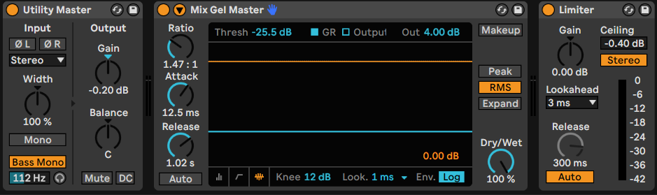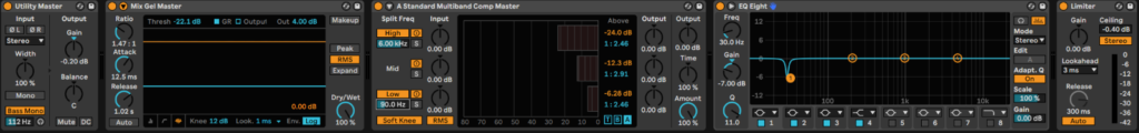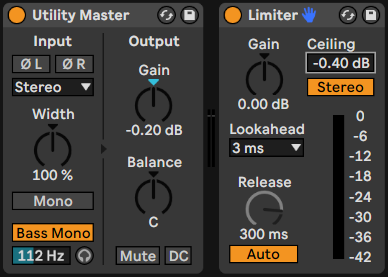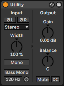 Als zweites benötigen wir das „Ableton Live Utility PlugIn“. Dabei platzieren wir das Utility PlugIn vor dem Limiter. So kannst du beispielsweise einstellen, ob dein Track mono oder stereo fahren soll.