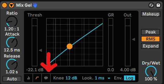 Du fügst das Mix Gel.adv vor dem Limiter und nach dem Utility PlugIn ein. Dann wechselst du die Ansicht des Compressors in den “Activity Mode”. Dafür drückst du unten links neben „Knee” auf das Symbol: