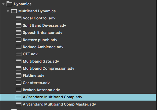 Als nächstes gehen wir zu den Multiband Dynamics. Wir benutzen die “A Standard Multiband Comp.adv” Vorlage von Ableton. Du findest sie unter Audioeffekte → Dynamics → Multiband Dynamics → A Standard Multiband Comp.adv.