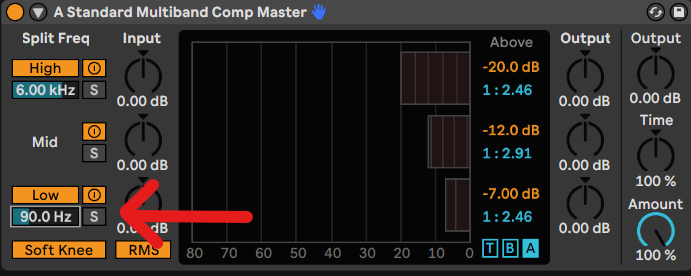 Setz´ den “A Standard Multiband Comp.adv” nun zwischen Limiter und Compressor. Zuerst nimmst du dir die Ratio´s vor; du findest sie unter Above (die blauen Zahlen). Mit der Ratio stellst du das Verhältnis ein. Du beginnst mit den High Frequenzen. Setz´ dort die Ratio auf ungefähr 1:2.46 und das Volumen oben drüber (in orange) auf –20dB. Nun zu der mittleren Ratio (den Mitten). Setz´ hier die Ratio auf ungefähr 1:2.91 und das Volumen auf –12dB. Und jetzt zu den Low`s. Dort setzt du die Ratio auf ungefähr 1:2.46 und das Volumen auf –7dB. Um wirklich nur die Low´s zur Compression zu führen setzt du die Frequenz links unten, unter Low auf ca. 90Hz.
