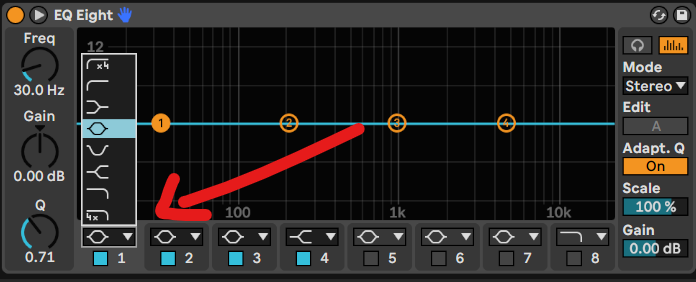 Wir fügen den Equalizer zwischen dem Limiter und dem Multiband Compressor ein. Als nächstes wählen wir den Modus des ersten Punktes aus.