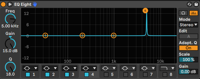 Jetzt ist es an der Zeit, unnötige und störende Frequenzen aus deinem Track herauszufiltern. Dafür brauchst du wieder den „EQ Eight“. Du fügst diesen EQ Eight zwischen dem ersten EQ Eight und dem Limiter ein. Als nächstes änderst du den Modus der ersten 4 Punkte. Du nimmst für alle 4 Punkte erneut den Modus “Notch”. Zuerst nimmst du dir den 4. Punkt vor. Um diesen auszuwählen, machst du einen Linksklick auf die 4. Du veränderst die Bandbreite unter dem Punkt Q auf 18 und änderst das Gain auf +15dB. Es sollte nun ungefähr so aussehen: