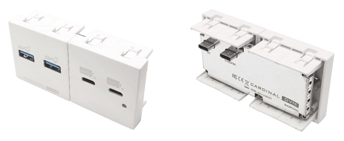 Unter der eigenen Hausmarke CARDINAL DVM präsentiert Sommer cable einen kompakten, integrierbaren 10G USB-3.2-Hub als Clip-In-Modul für die 45 mm SYSWALL-Schalterrahmenserie. Er passt perfekt in die hauseigenen Tischeinbaurahmen SYSFRAME45 und Kanalprofile SYSTRUNK sowie in alle anderen marktüblichen 45 mm Anschlusseinheiten (Smarthome-Module etc.).