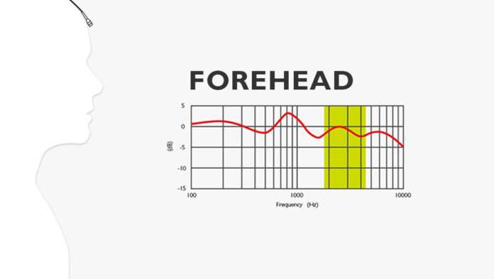 Ein Headset-Mikrofon sitzt am Mundwinkel und ist für die Sprachverständlichkeit besser als die Ohr-Position. Der Bereich von 1 – 2 kHz bleibt etwas stärker erhalten. Die Konsonanten in diesem Frequenzbereich klingen natürlicher und daher ist die Verständlichkeit deutlich besser. Diese Platzierung befindet sich ein wenig hinter der Schallquelle und büßt somit einige der extrem hohen Frequenzen ein. Diese Position ist jedoch nicht so gut wie die Stirn-Platzierung.