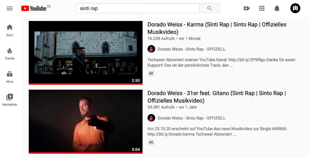 Die Videos des Newcomers Dorado Weiss werden bei der Suche nach Sinti- oder Sinto-Rap (In Sinti-Kreisen stark gesucht) weit oben gelistet und bekommen ganz von alleine und ohne Werbung Views. Warum das so ist? Ganz einfach! Sein Kanalname ist folgendermaßen aufgebaut: